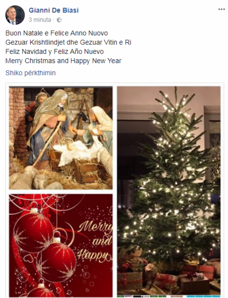 Ish-trajneri i kombëtares shqiptare Gianni De Biasi, ka uruar sot festat e fundvitit. Por ajo që të bie më shumë në sy, është se De Biasi urimin e tij e ka bërë në 4 gjuhë të ndryshme, në anglisht,italisht, spanjisht dhe Shqip.