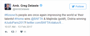 “Populli i Kosovës përsëri është duke befasuar botën me talentet e tij! ‘Home’ fiton në BAFTA & Majlinda (të artën!), Distria duke fituar në Judo Paris 2017”, ka shkruar Delawie.