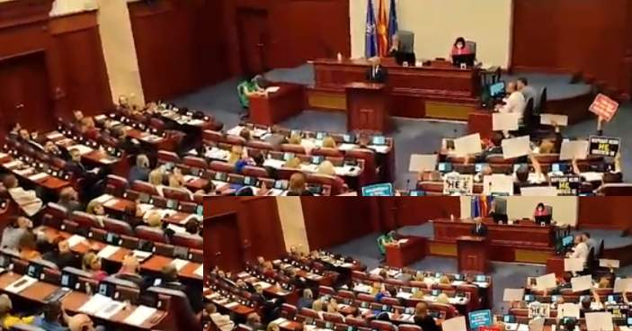 Opozita gjatë fjalimit të kryeministrit Kovaçevski në seancën për propozimin francez, po mundohen që të pengojnë me vuvuzela duke shkaktuar zhurma në Kuvend.
