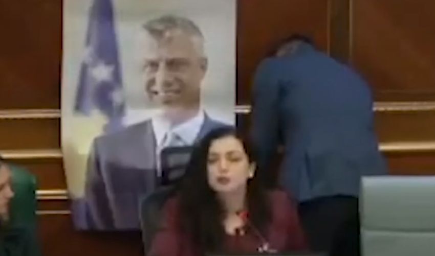 Me të filluar Kuvendi i Kosovës, deputeti i Partisë Demokratike të Kosovës, Mërgim Lushtaku ka vendosur prapa karriges së kryetares së Kuvendit të Kosovës, Vjosa Osmani fotografinë e presidentit Hashim Thaçi.