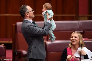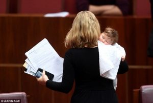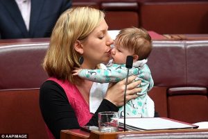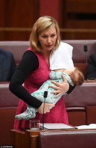Ajo është fotografuar duke mbajtur një peshqir të bardhë në kraharor ku edhe e kishte vendosur foshnjën që e ushqente me gji, derisa në një moment kolegu i saj senatori Richard Di Natale është parë duke mbajtur vogëlushen Alia.