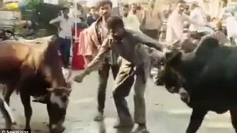Disa po e quajnë trimëri e disa budallallëk, por një burrë i cili është munduar të ndalojë demat që të “ndeshen”, e ka pësuar vetë keq kur e futen në mes dhe nga goditjet e forta nga të dyja anët e përplasën në tokë.