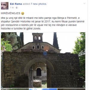 Mëngjesi i ditëlindjes ishte një mëngjes si gjithë të tjerët për Edi Ramën. Si zakonisht ai e nisi ditën me pamje nga Shqipëria, e sot ka zgjedhur një Kishë të vjetër në Bënjë të Përmetit.