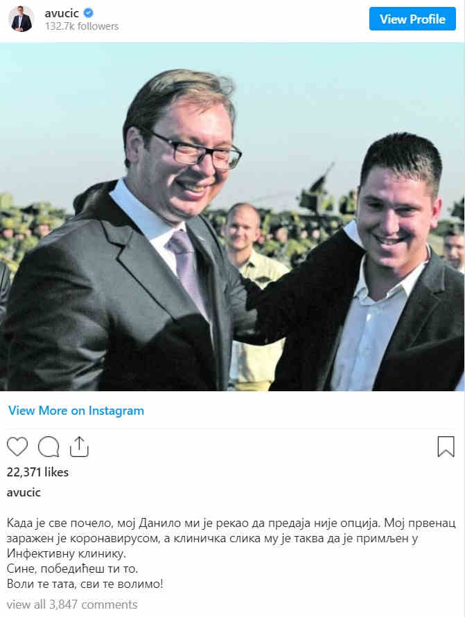 “Biri im ishte infektuar me koronavirus dhe gjendja e tij klinike është e tillë që ai u pranua në Klinikën e Sëmundjeve Infektive”, ka shkruar Vuçiq në Instagram.