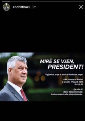 “Mirë se vjen, president! Të gjithë në pritje të heroit të luftës dhe paqes. Pika kufitare në Morinë. E premte, 17 korrik 2020, ora 19:30. Eja edhe ti! Merre flamurin me veti. Vendose maskën dhe mbaje distancën”, ka shkruar Endriti në postimin e tij.