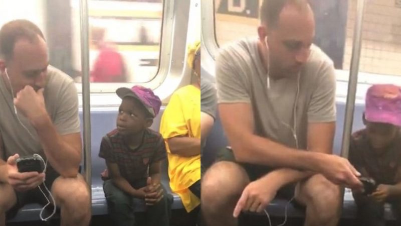 Aty shihet se si djali ishte koncentruar me gjithë vëmendjen dhe po e shikonte burrin afër tij, teksa luante një lojë në telefon. Kur burri e pa se djali po e shikon, ia dhuroi atij pajisjen në mënyrë që të luajnë bashkë derisa udhëtojnë.