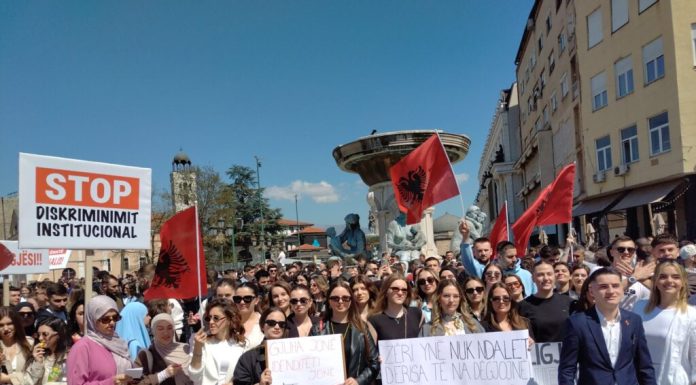 “Fillkov dorëheqje” dhe “Gjuha shqipe nuk negociohet” ishin mesazhet kryesore që dominuan protestën e studentëve shqiptarë sot në Shkup raporton INA.