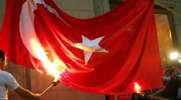 Gjatë kësaj proteste, pjesëmarrësit kanë djegur edhe një flamur turk, gjë e cila i ka nervozuar turqit.