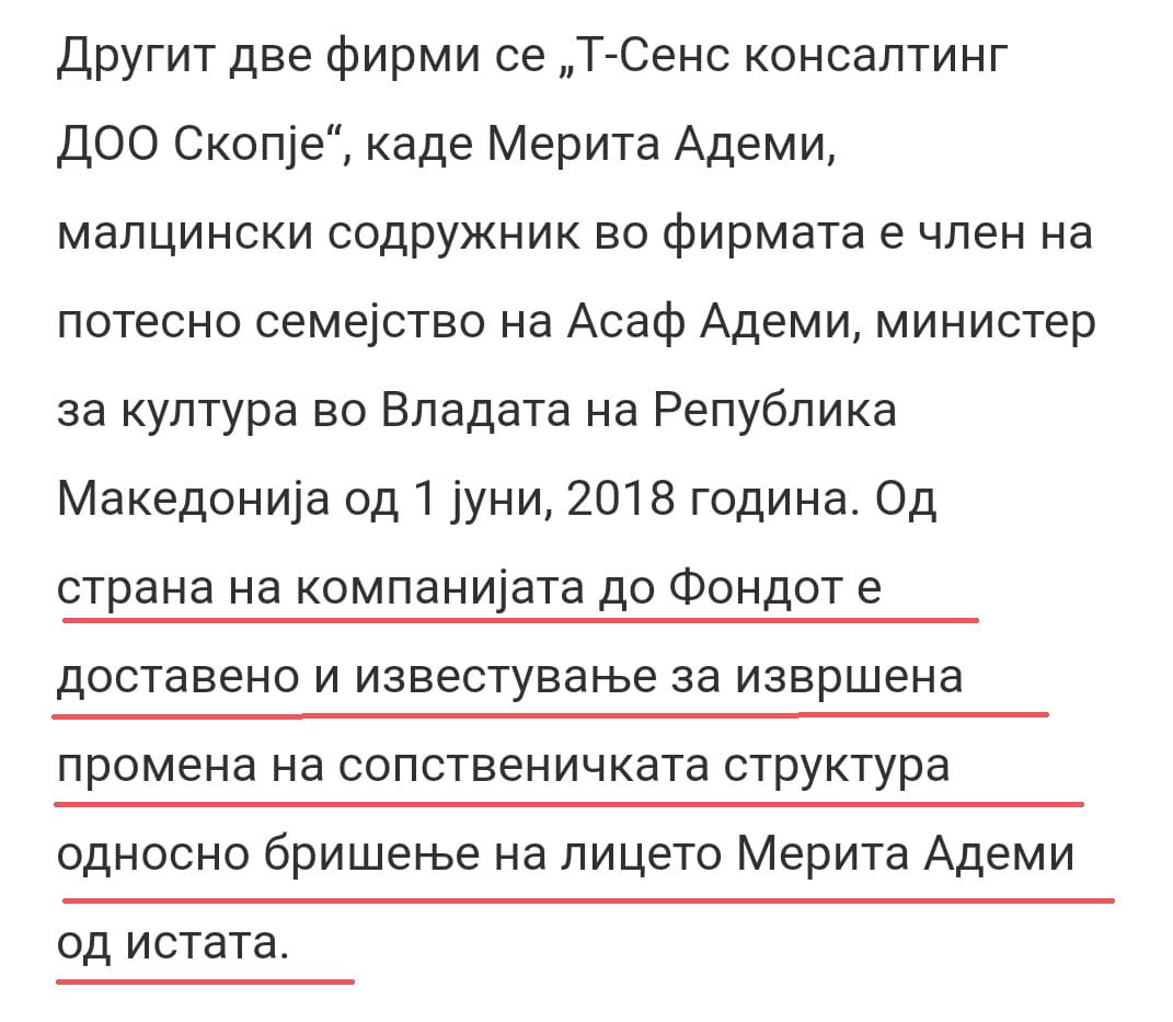 Në njoftimin zyrtar të Fondit për Inovacione bëhet e ditur se kompania e ka njoftuar Fondin se bashkëshortja e Ademit nuk është më bashkëpronare e asaj kompanie.