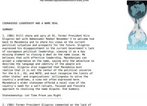 Ish-ambasadori amerikan në Shkup, Philip Ricker, ka dërguar raport nga 5 nëntori i vitit 2018, të titulluar si “Maqedonia: Ish-presidenti Gligorov ka bërë thirrje për lidership të guximshëm dhe zgjidhje për emrin”, publikoi Wikileaks.
