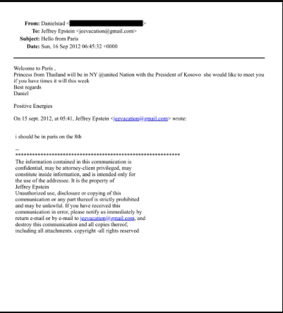 Në mesazhet e publikuara nga Departamenti Amerikan i Drejtësisë, dosja Jeffrey Epstein, përmendet edhe ish-presidentja e Kosovës, Atifete Jahjaga, e cila mbante këtë pozicion në vitin 2012.