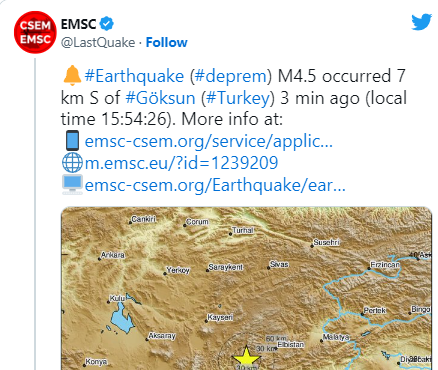 Ndërkohë raportohet se atje ka pasur edhe një tërmet të dytë ka qenë me magnitudë 4.2 ballë me epiqendër tre kilometra në perëndim të Goksunit.