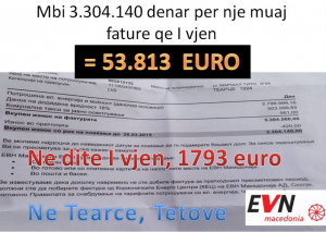 Mbi 53 mijë euro para dy viteve ishte një faturë e energjisë elektrike e një konsumatori në Tearcë të Tetovës. Kjo faturë ishte publikuar në forumin social “Ta heqim 33 për qind, prej faturave të EVN” në facebook.