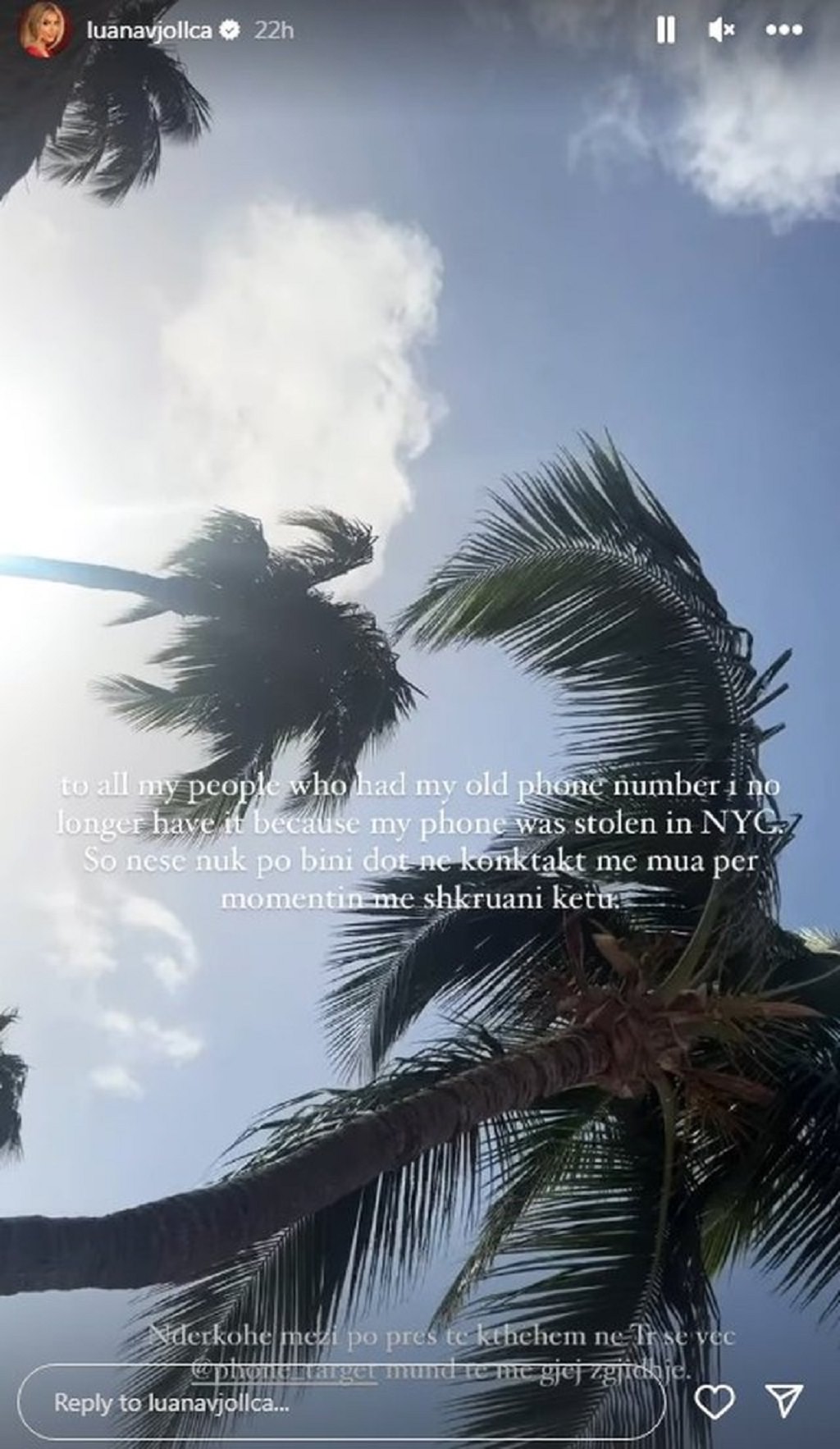 “Të gjithë ata që kanë numrin tim të vjetër, ju njoftoj që nuk e kam më sepse telefonin ma vodhën në New York. Nëse nuk po më kontaktoni dot, për momentin më shkruani këtu”, shprehet Luana.
