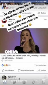 Pas një fotoje nga portalet në Kosovë, Aida ka shkruar: “Qe nja dy tri her pom vrajn qishtu qito Gazeta. Mazi edhe kur t’vdes pernime tutna skan me besu ma”.