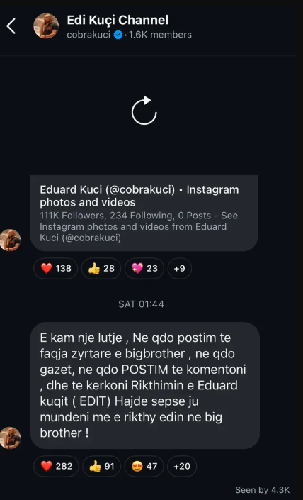 Në mesazhin e publikuar, Edi u ka bërë thirrje fansave që të komentojnë kudo për rikthimin e tij në lojë. “E kam një lutje, në çdo postim te faqja zyrtare e Big Brother, në çdo gazetë, në çdo postim të komentoni dhe të kërkoni rikthimin e Eduard Kuqit (Edit). Hajde sepse ju mundeni ta riktheni Edin në Big Brother”, ka shkruar ai, duke lënë të kuptohet se shpreson ende në një mundësi të dytë.