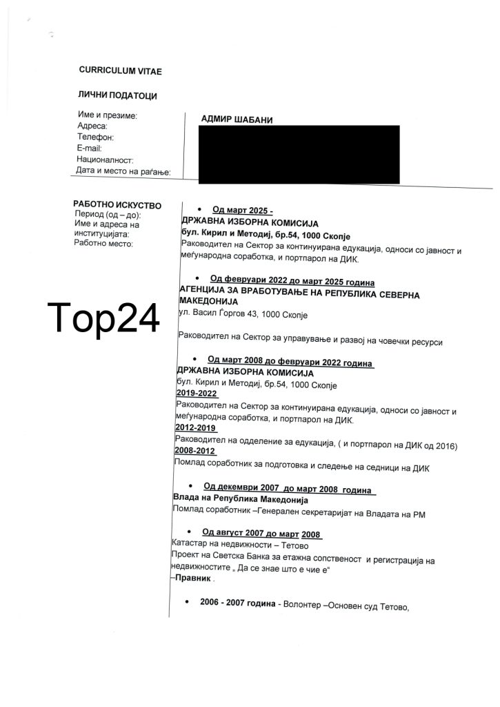 Sipas dokumentit të dorëzuar, Admir Shabani është propozuar për të marrë detyrën e zëvendësministrit në Ministrinë e Mbrojtjes, duke u bërë pjesë e strukturës drejtuese të Armatës së Republikës së Maqedonisë së Veriut. Propozimi tashmë ka hyrë në procedurë parlamentare dhe pritet të votohet nga deputetët në seancën e ardhshme parlamentare, shkruan Top24