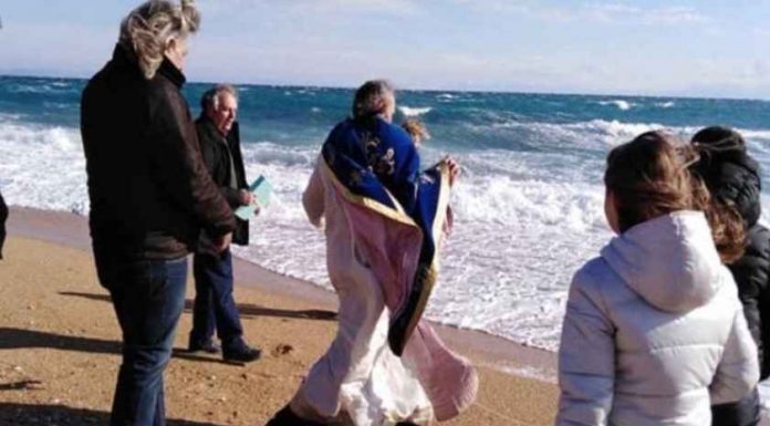 Besimtarë të shumtë, edhe pse kishte një erë tmerrësisht të tërbuar. janë ndodhur sot në Skala Kefalonia në Greqi për të marrë pjesë në ritin e hedhjes së Kryqit në Ujë.