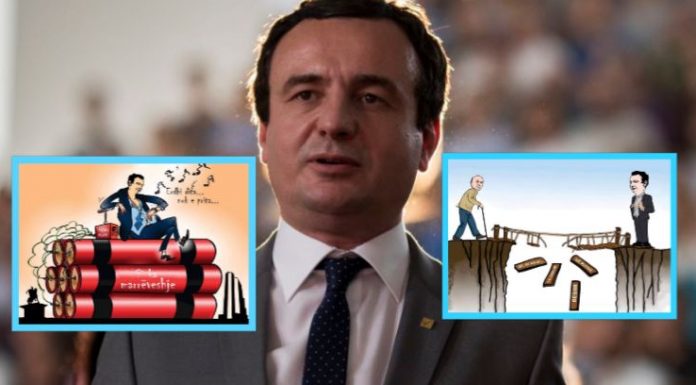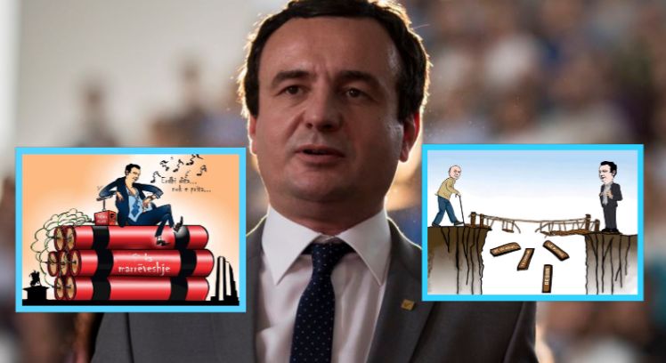 Në një kartikaturë të publikuar së fundi në Facebook, Kurti shihet mbi një sasi të madhe dinamiti, nën tingujt e një muzike me refren ‘Erdhi dita…nuk e prita’.