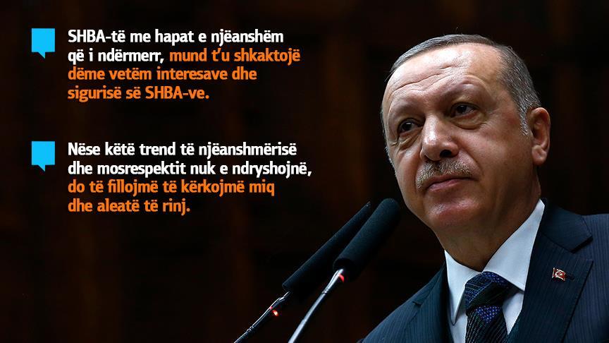 “Partneriteti jonë mund të rrezikohet, nëse SHBA-të nuk fillojnë së respektuari sovranitetin e Turqisë dhe dëshmojnë se kuptojnë rrezikun me të cilin përballet kombi ynë”, tha Erdoğan.