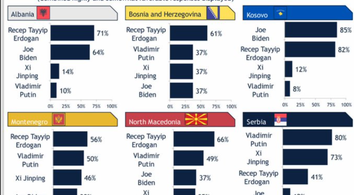 Në Maqedoninë e Veriut, nga ana tjetër, publiku tradicionalisht e admiron Erdoganin me 66% dhe presidentin rus Vladimir Putin 49%, ndërsa i treti radhitet presidenti amerikan Biden me 37%. Pas tij radhitet kinezi Jinping me 35%.(INA)