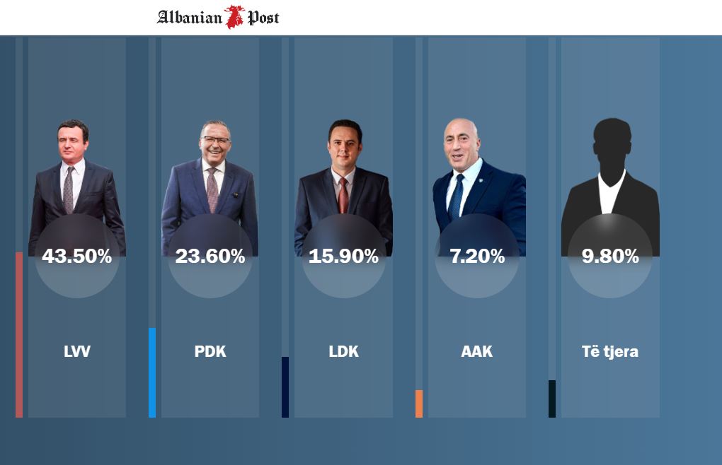 Sipas të dhënave të Exit Poll-it të Albanian Post, në zgjedhjet parlamentare të 28 dhjetorit, Lëvizja Vetëvendosje ka marrë 43.50% të votave.