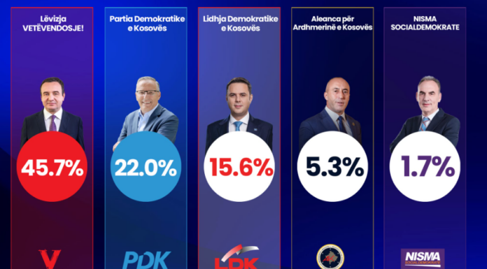 Sipas të dhënave, Albin Kurti ka siguruar 45.7 për qind të votave.