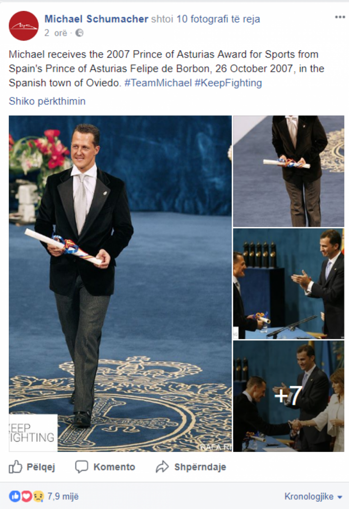 Hidhërimin më të madh ka bërë një postim në profilin e tij, me fotografi të cilat janë shkrepur para aksidentit të vitit 2013. Në 2007, Michael ka marrë Çmimin e Princit të Asturias për Sportet”.