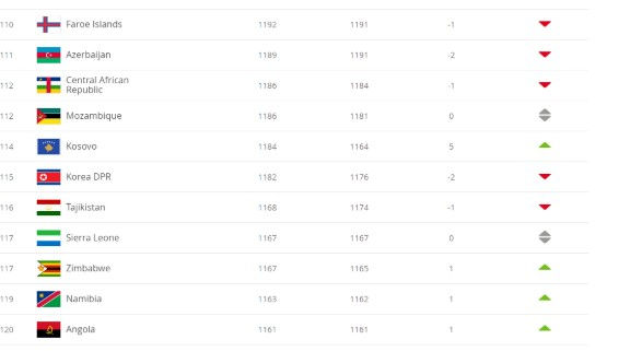 Kosova ishte në pozitën e 119-të, ndërsa tani në renditjen e re zë vendin e 114-të me 1184 pikë.