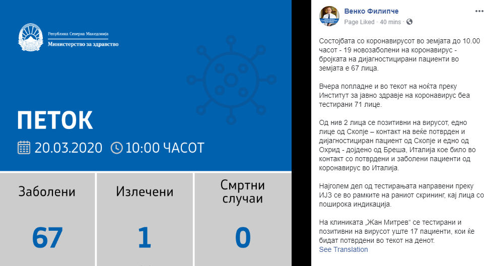 Ministri i Shëndetësisë, Venko Filipçe në faqen e tij zyrtare në Facebook ka lajmëruar numrin e pacientëve të prekur nga kronavirus në vend.