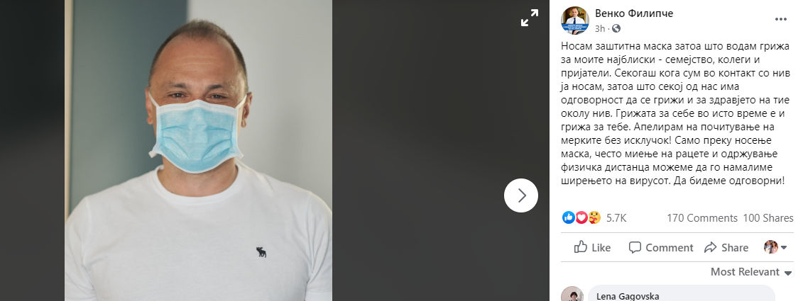 Mjekët dhe personat mjekësor çdo ditë punojnë me maska mbrojtëse dhe pajisje mbrojtëse shtesë, por edhe në shumë profesione të tjera punëtorët tërë orarin e punës e kalojnë me pajisje mbrojtëse. Nuk është e vështirë dhe s’ka arsyetim për ata që nuk mbajnë maska, të cilët nuk i respektojnë masat. Kështu ka apeluar sot ministri i Shëndetësisë, Venko Filipçe që të respektohen masat kundër Covid-19.