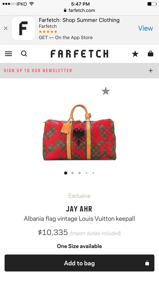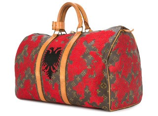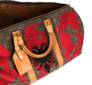 Çantë nga lëkura ngjyrë kafe, ku sipër saj janë qëndisur pjesë më të kuqe dhe sipër të kuqes gjendet shqiponja dy krenare, është njëra nga modelet e shumta të markës së njohur botërore, por njëkohësisht edhe më të shtrenjtës, Louis Vuitton.