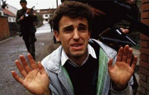 Në këtë fotografi Hajrush Ziberi lutet për jetën e tij, pasi ai kapet nga kriminelët serbë në Bosnjë në vitin 1991. Ai torturohet dhe me pas vritet nga “Tigrat e Arkanit”.