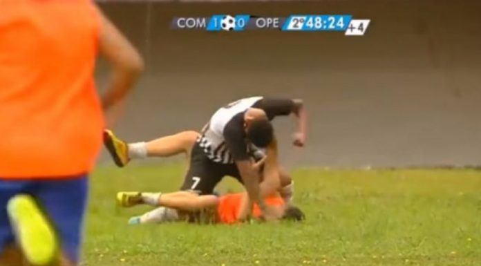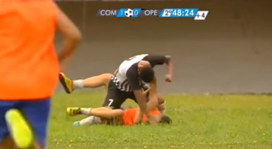 Jefferson Reis, lojtar i Operario MS, goditi me grushte një nga djemtë që kapin topat pasi ky i fundit po festonte një gol.
