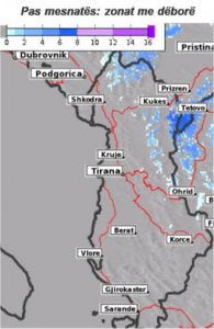 “Meteoalb” ka publikuar edhe “hartën e dëborës”, ku identifikohen zonat ku pritet të ketë reshje bore me fillimin e së shtunës. /albeu.com/