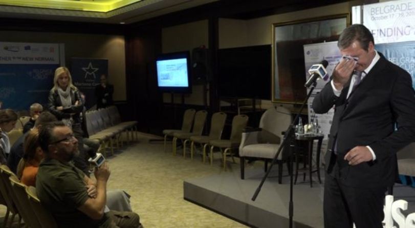 Menjëherë pas kësaj, kur ai po merrte një pyetje nga një gazetar tjetër, presidenti serb po fshinte djersët duke dëshmuar se nuk ishte i koncentruar në pyetjen që po i bëhej. Ndonëse pyetja iu bë në gjuhën angleze, ai është përgjigjur në serbisht, por gjatë konferencës është përgjigjur edhe në gjuhën angleze.
