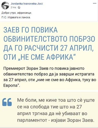 Zaevi vitin e kaluar kishte shkruar: Sa më shpejt duhet të zbardhet dhe pastrohet rasti i 27 prillit, sepse Maqedonia nuk është Afrikë. Pikërisht kjo porosi e Zaevit ka bërë që gazetarja maqedonase Joci të ironizon dhe të thumbon kryeministrin me porosinë: “Mirëmëngjesi, afrikanë. P.S, deklarata është e vitit të kaluar e Zaevit”.