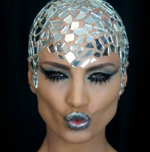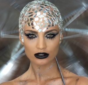 Make up artisja Vlora Ismajli, i ka realizuar këngëtares një grim profesional të ndërthurur me copëza pasqyrash në kokën e saj.