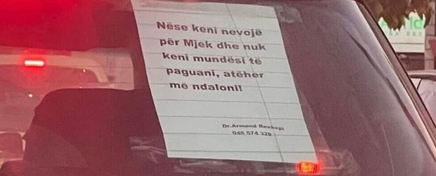 Mjeku Armend Rexhepi, nga Gjilani ka bërë një gjest human për qytetarët e Kosovës. Ai ka vendosur një letër në xhamin e pasmë të makinës së tij.