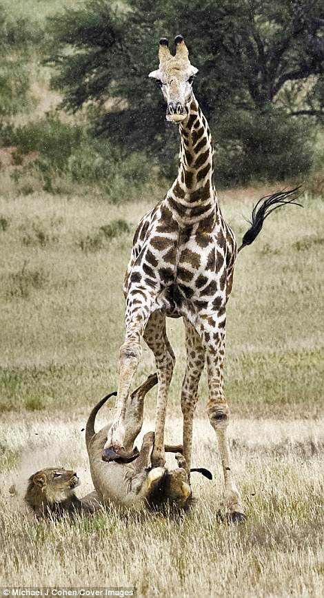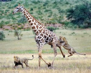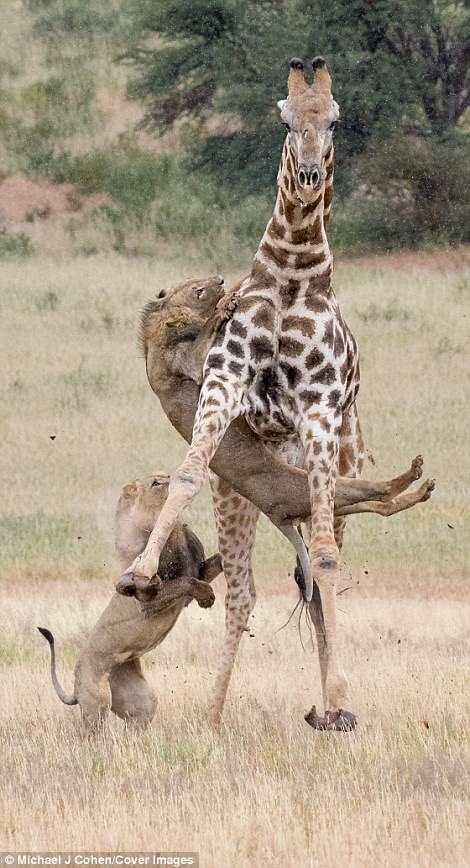 Fotografi të mahnitshme janë kapur nga Michael Cohen, të cilat tregojnë dy luanë që bëjnë të pamundurën për të rrëzuar një gjirafë.