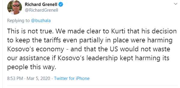 Ndaj këtij postimi është përgjigjur Grenell i cili ka thënë se kjo nuk është aspak e vërtetë, dhe se Kurtit i janë bërë të qarta qëndrimet e SHBA’së.