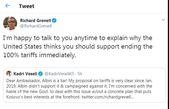 “Unë jam i lumtur të bisedoj me ju në çdo kohë për të shpjeguar pse Shtetet e Bashkuara mendojnë se duhet të mbështesni përfundimin e tarifave 100% menjëherë”, ka shkruar Grenell në Twiter.