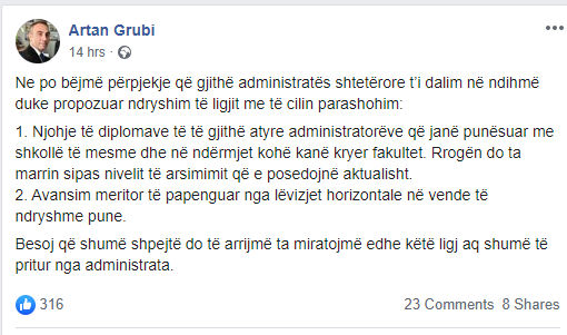Besoj që shumë shpejtë do të arrijmë ta miratojmë edhe këtë ligj aq shumë të pritur nga administrata.”- shkruan Grubi.