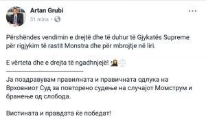 “Përshëndes vendimin e drejtë dhe të duhur të Gjykatës Supreme për rigjykim të rastit Monstra dhe për mbrojtje në liri. E vërteta dhe e drejta të ngadhënjejë”, ka shkruar ai në “Facebook”.