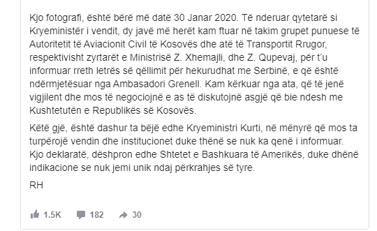 “Kjo fotografi, është bërë më datë 30 Janar 2020. Të nderuar qytetarë si Kryeministër i vendit, dy javë më herët kam ftuar në takim grupet punuese të Autoritetit të Aviacionit Civil të Kosovës dhe atë të Transportit Rrugor, respektivisht zyrtarët e Ministrisë Z. Xhemajli, dhe Z. Qupevaj, për t’u informuar rreth letrës së qëllimit për hekurudhat me Serbinë, e që është ndërmjetësuar nga Ambasadori Grenell. Kam kërkuar nga ata, që të jenë vigjilent dhe mos të negociojnë e as të diskutojnë asgjë që bie ndesh me Kushtetutën e Republikës së Kosovës”, shkruan Haradinaj.