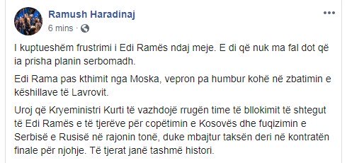 “I kuptueshëm frustrimi i Edi Ramës ndaj meje. E di që nuk ma fal dot që ia prisha planin serbomadh”, shkruan Haradinaj pasi kryeministri Edi Rama u shpreh kundër tij në Twitter.