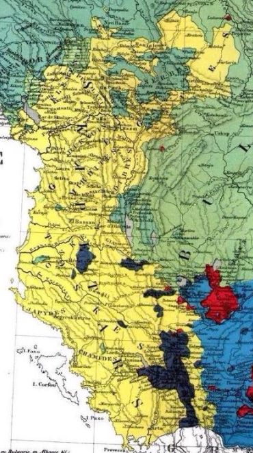“Pjese nga harta etnografike e vitit 1861, para Kongresit te Berlinit, realizuar nga frengu Lejean (mos harrohet se francezet kishin aksesin me te madh ne territoret e Perandorine Osmane ate kohe, e per rrjedhoje kishin mundesi te mira per studimin etnografik te popujve dhe etnive qe e popullonin ate).