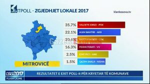 Sipas exit-pollit të Klan Kosovës, kandidatja e PDK-së për kryetare të Mitrovicës, Valdete Idrizi, ka marrë 35,7 për qind. Ndërsa, Fehmi Ferati nga VV-ja doli i katërti me 16,3 për qind