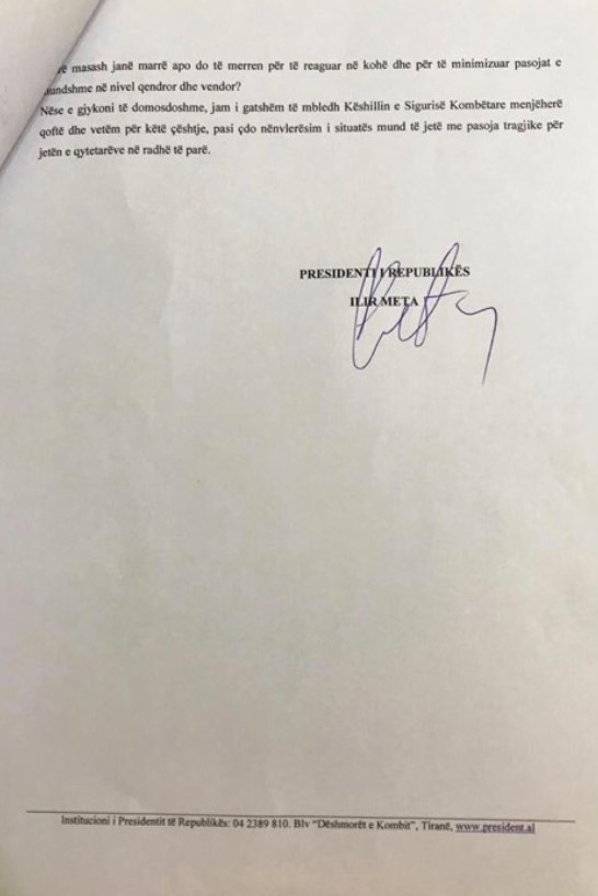 Meta i kërkonte llogari qeverisë për masat e marra dhe kërkonte informacion mbi situatën. Por më pas nga Qeveria ishte injoruar ky paralajmërim i presidentit Meta.