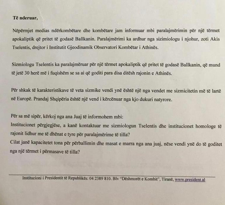 Presidenti Ilir Meta gjatë verës kishte paralajmëruar tërmet të fuqishêm, duke e konsideruar si apokaliptik. Në një letër me të cilën u ishte drejtuar i shqetësuar kryeministrit Edi Rama, ministrit të Brendshëm, Sandër Lleshaj dhe ministres së Mbrojtjes, Olta Xhaçka, kreu i shtetit thotë se sipas një sizmiologu të vjetër grek, Ballkani do të goditet nga tërmet i fuqishëm apokaliptik.